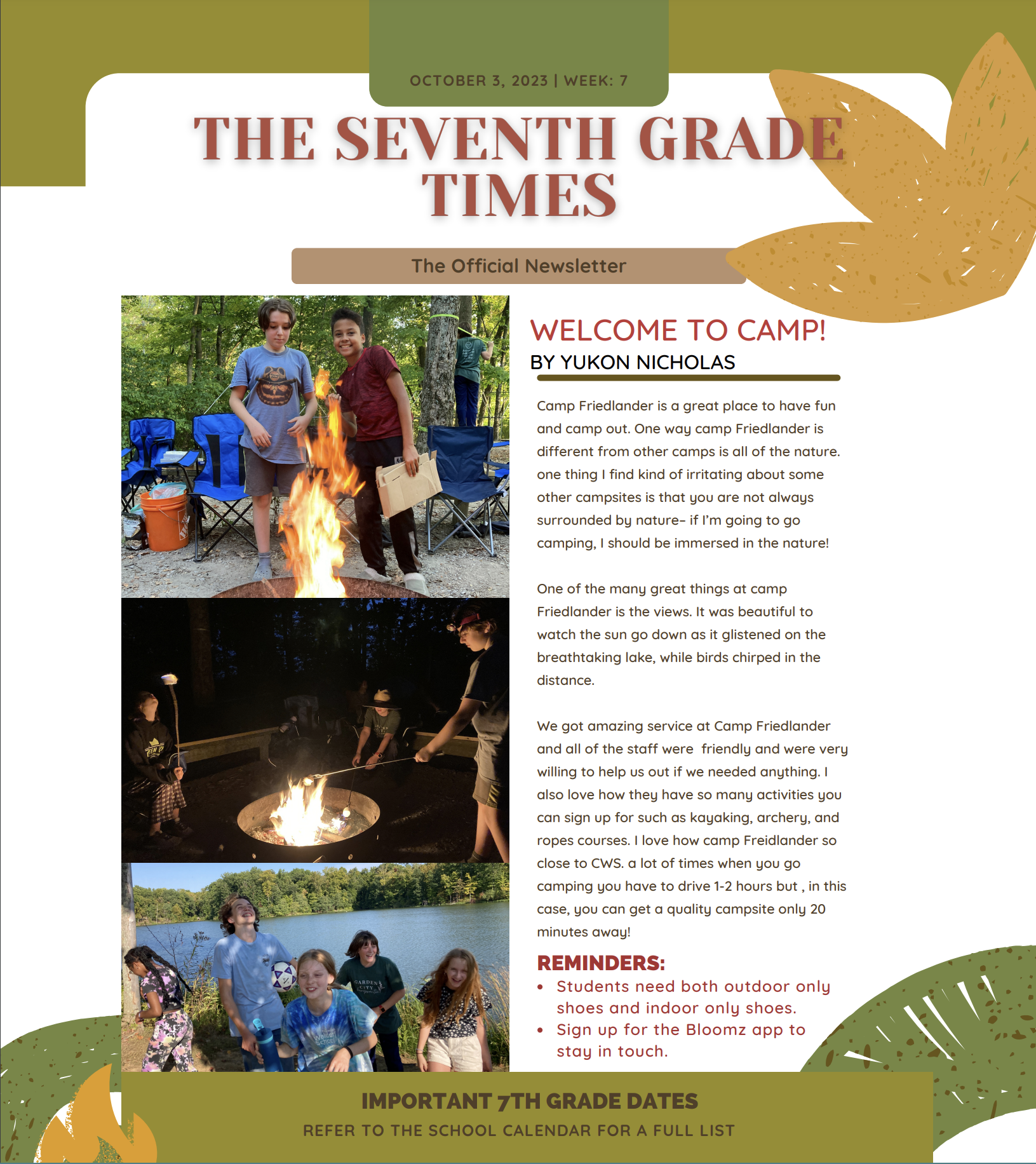 This edition of The Seventh Grade Times features articles about the class's recent camping trip. Join our Seventh grade journalists and share in the fun times at Camp Friedlander!